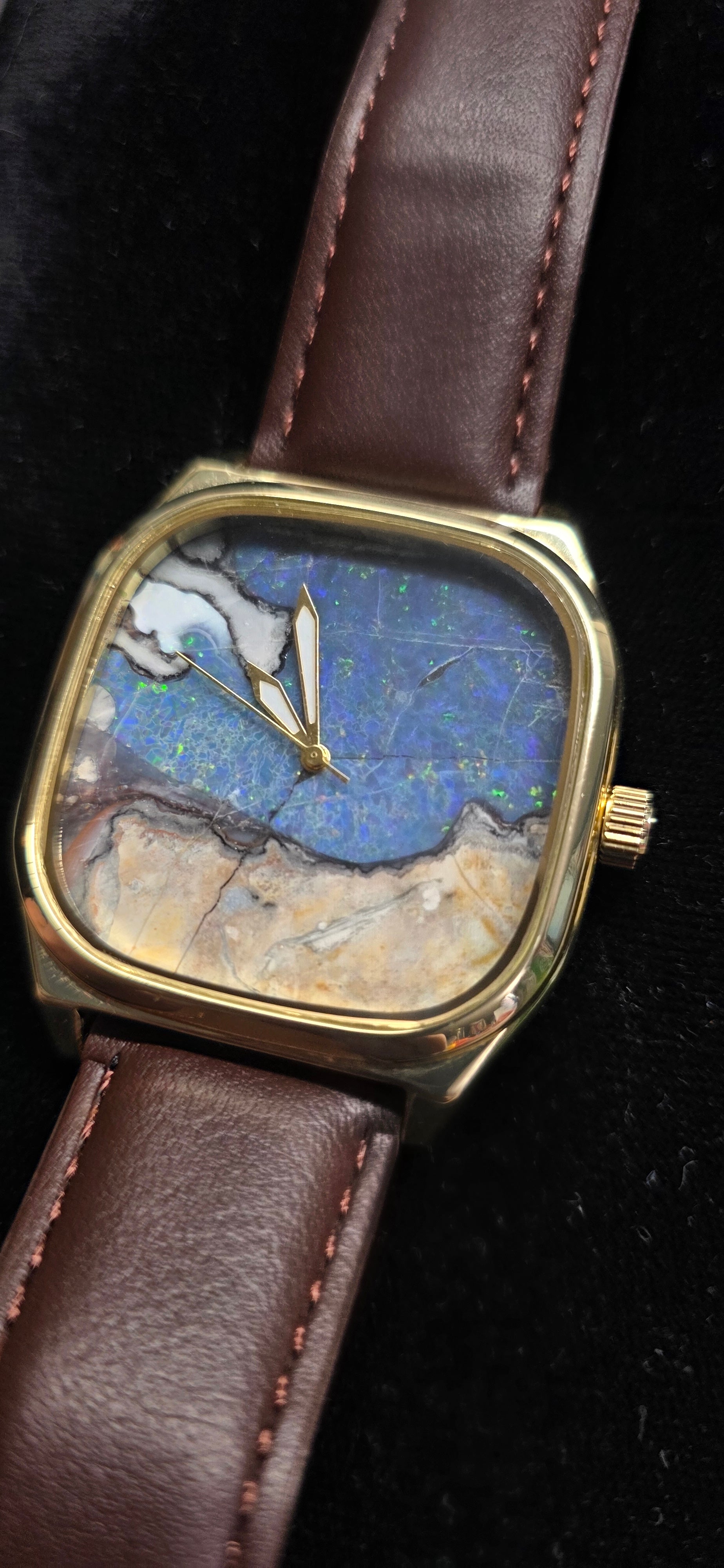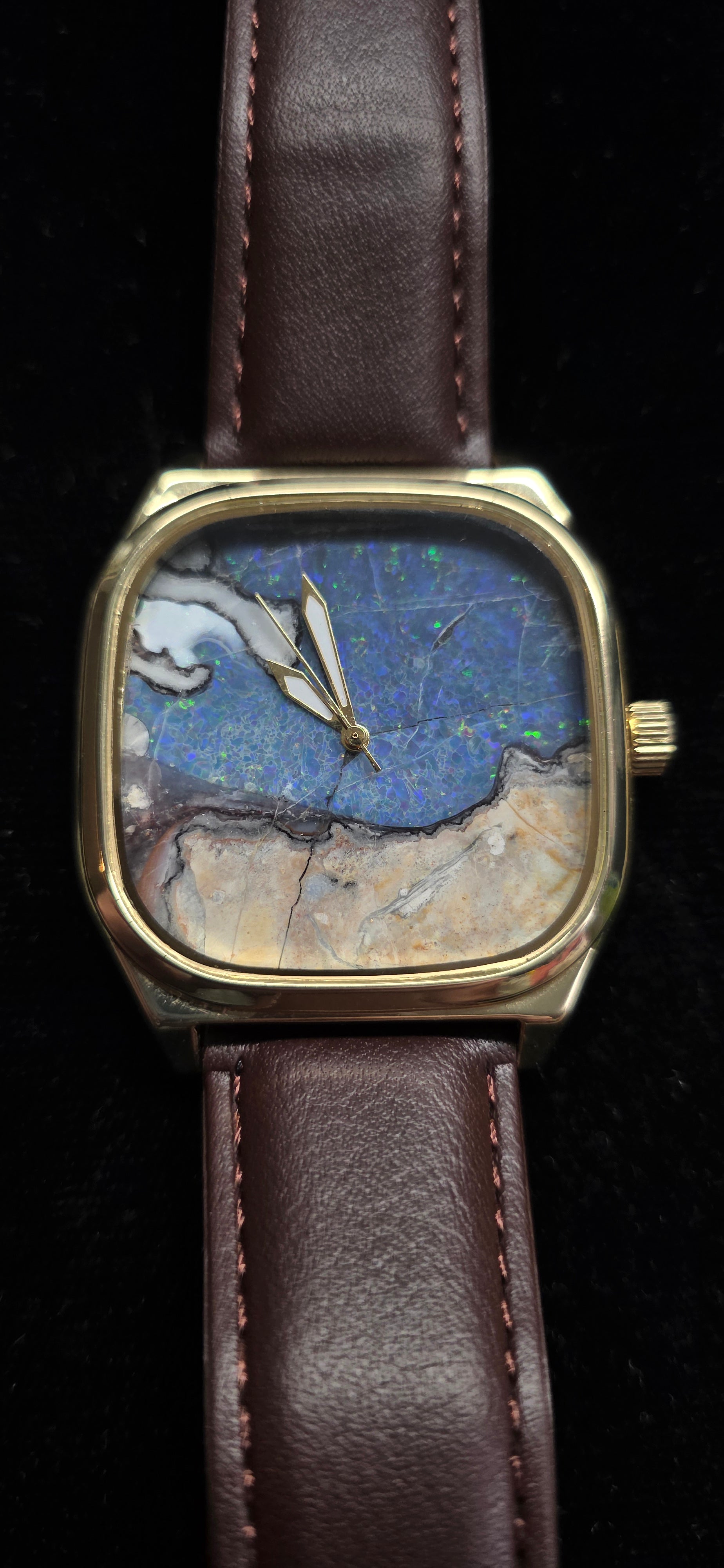 This watch is a little more expensive because of its larger size and composition of the stone. Opal this size is hard to come by. This is a hand cut Spencer Opal Doublet watch. it has a Japanese quartz movement in it. it is brown and gold! the tan section at the bottom is rhyolite the host rock of the opal!
