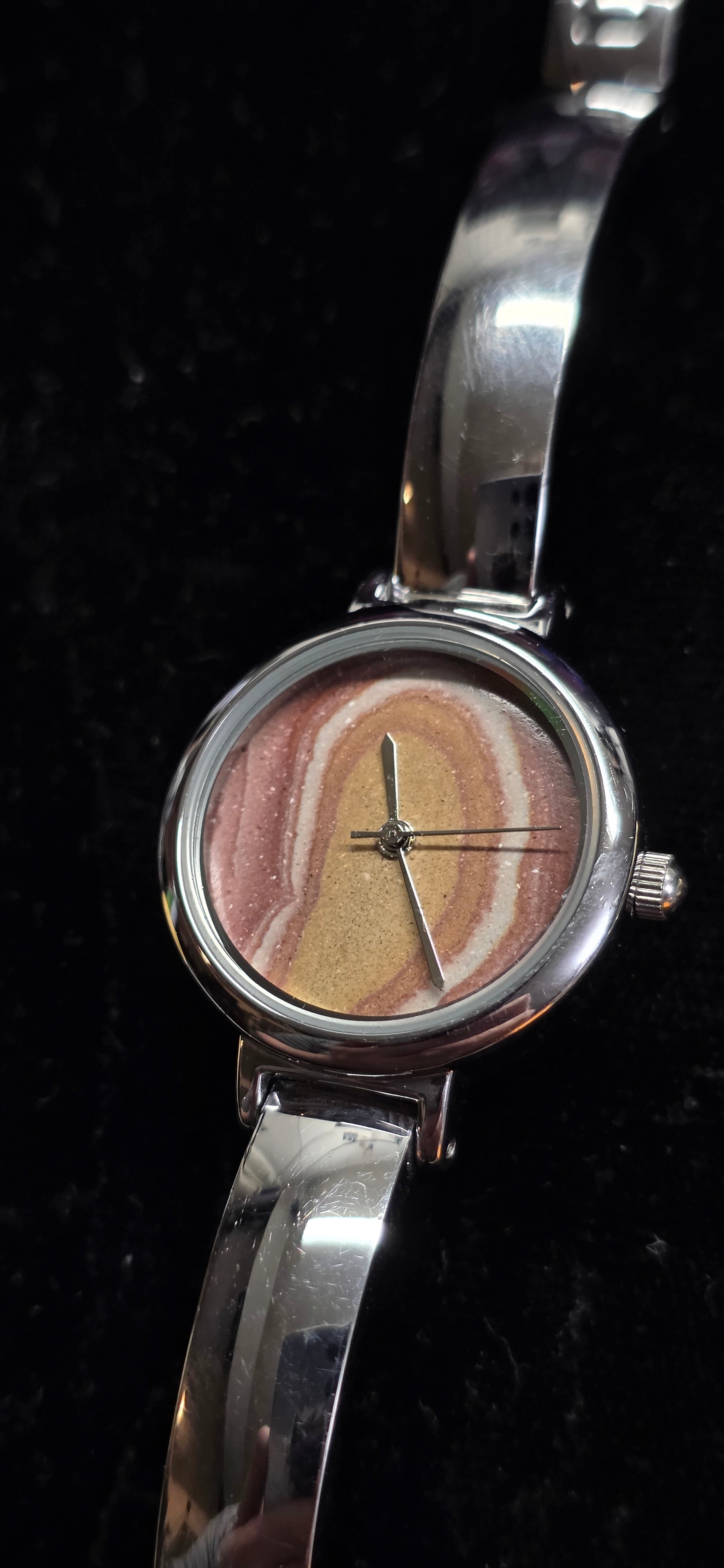 This is a small watch it's a 7-7.5 inch band so this is for someone with small wrists. the wonderstone is from utah and was hand cut by me. it is a silver on silver tone watch. It also has a Japanese watch movement in it!